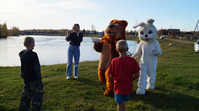 Но кульминацией праздника стало появление сказочных гостей – медведя и зайца! Лесные жители, словно сошедшие со страниц доброй сказки, щедро одарили всех сладкими угощениями.